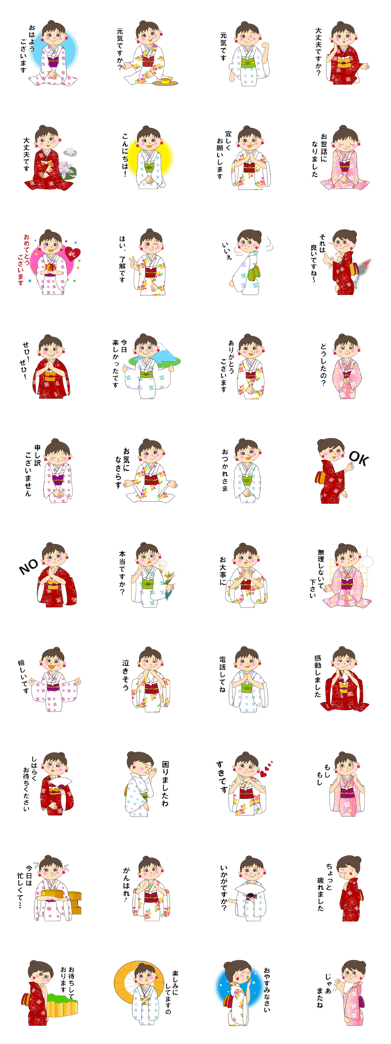 ミミさんの着物姿の和風スタンプが登場しました。日本らしい和風なスタンプです。ミミさんの笑顔と素敵な着物を楽しみくださいね!