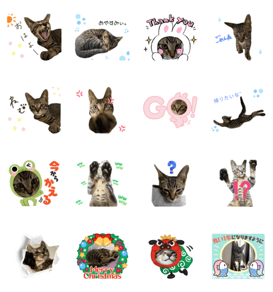 保護猫キジトラれおくん(0歳)がモデルのスタンプです!表情豊かで可愛いです★是非使ってください♪