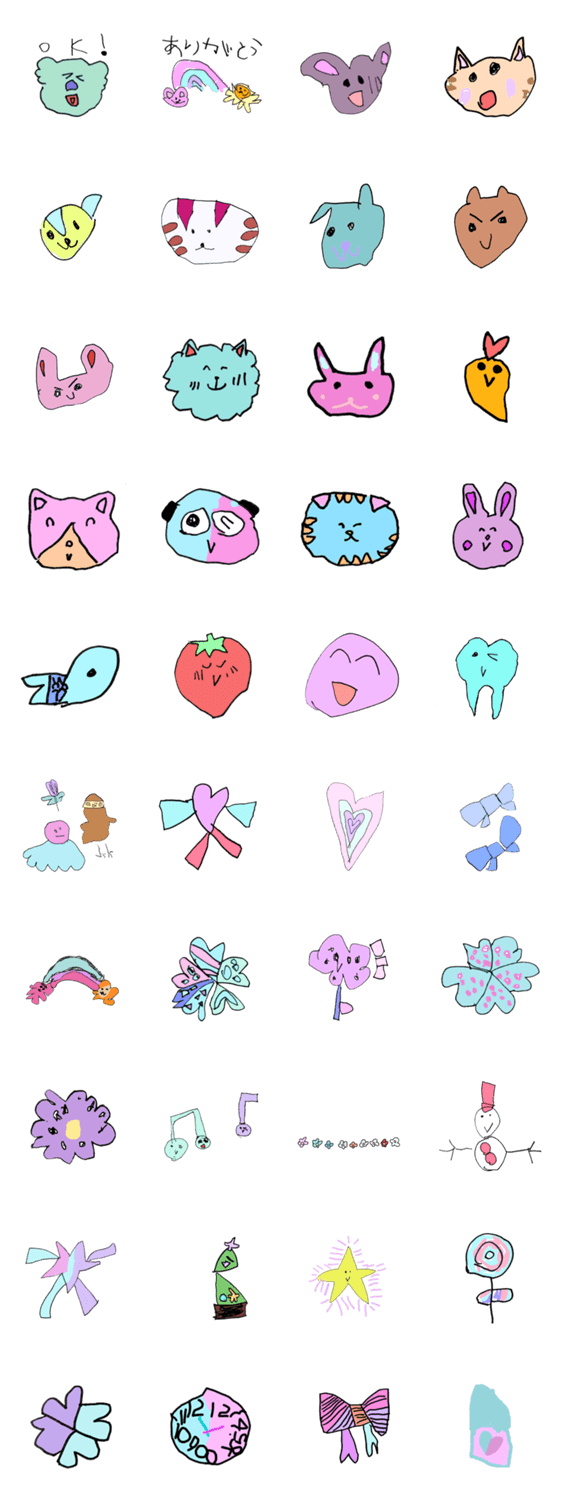 5歳の女の子が書いた絵と文字の可愛い動物やお花などのスタンプです。カラフルな色でたくさんの人を元気にしたいです。