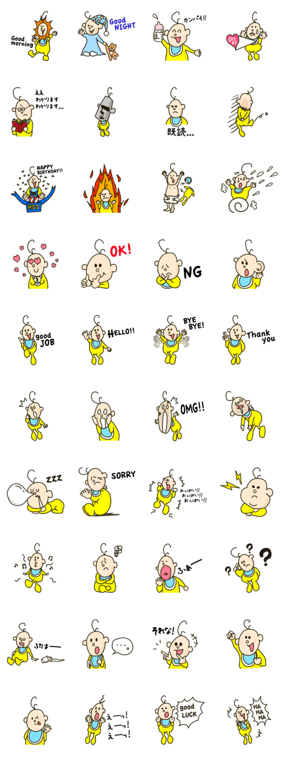 2本のちょろ毛がトレードマークの赤ちゃんに、日常で使える言葉を代弁させました。ママはもちろん、友達同士で使っても違和感ないと思います!