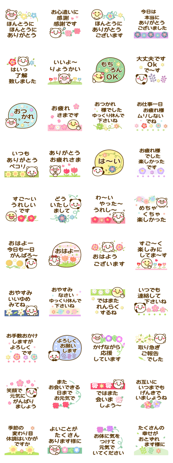 かわいい動物達の【もらってうれしい気持ちたっぷり】①花 長文スタンプです♪タメ語 敬語両方入りで、シンプルで誰にでも使えて便利!です。パンダ ねこ ぶた❤作:usakazu1