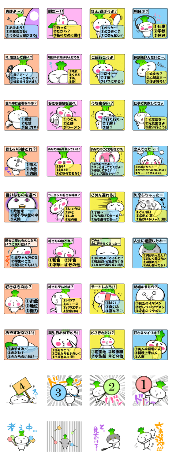 相手に番号を選んでもらうだけで簡単にトークができるスタンプ。言いづらいことや聞きづらいことは3択問題にして聞いちゃおう!3択が主だが、稀に4択もあるよ♪