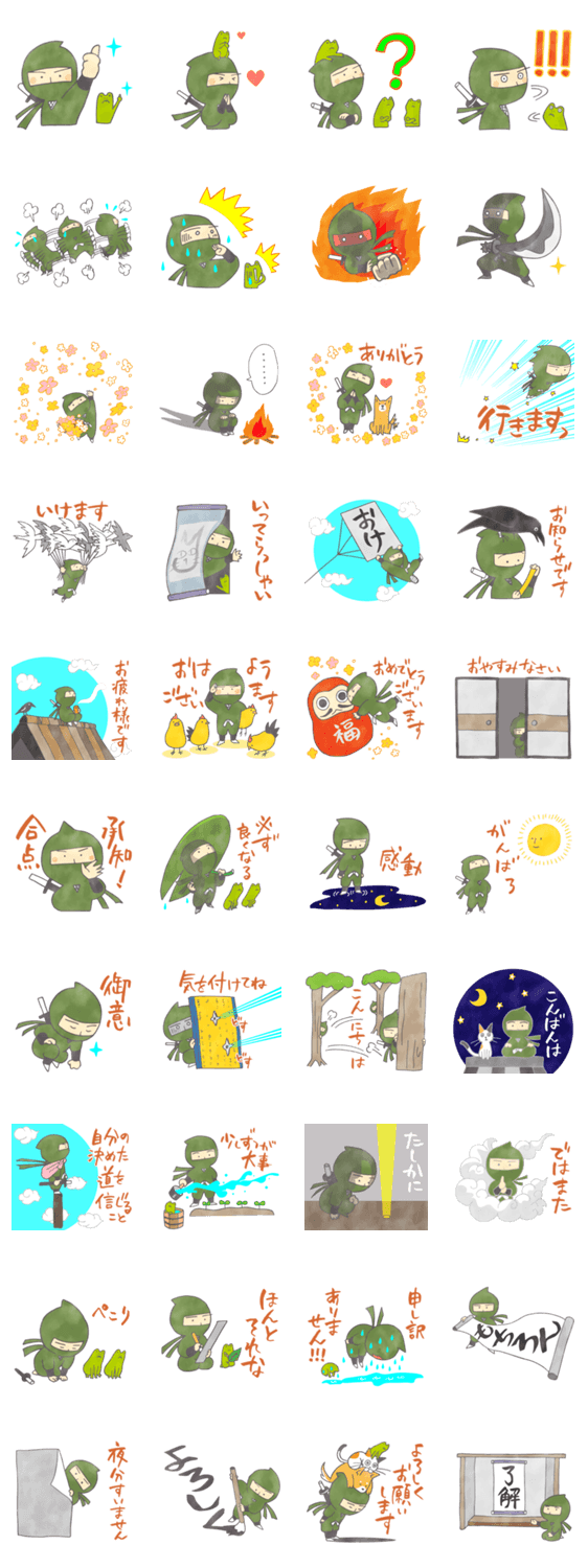 忍者のスタンプです。言葉は背中を押す風になります。画像は50音順に並べました。この気持ちをすぐに探せますように。