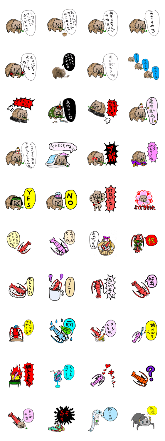 がんばれなって慰めてくれるウォンバットさんとかエビや他の動物です。可愛い。