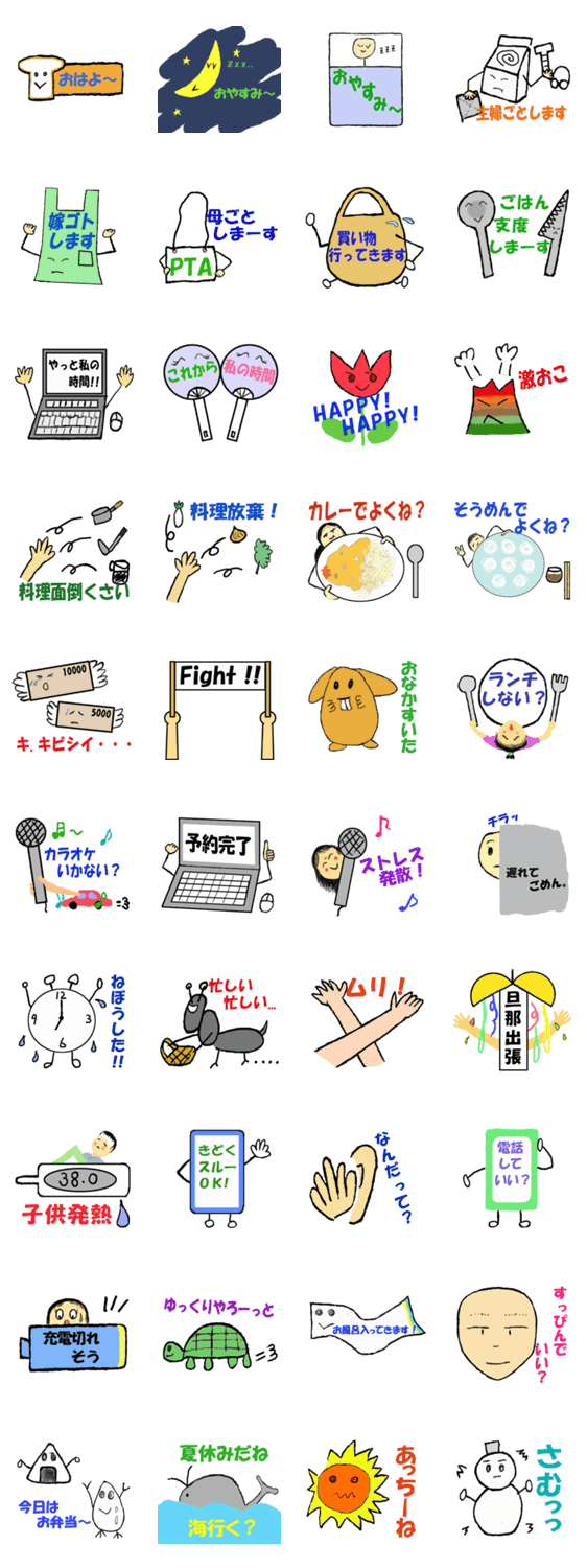 主婦専用スタンプをラインナップ致しました。忙しい時、マッタリしている時、様々なシチュエーションで使ってみて下さい。