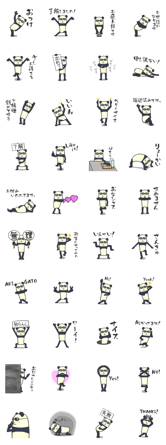 前回に引き続きのサングラスの白黒パンダ。喜んだり、ハートを飛ばしたり、いいねしたり、了解、お疲れ様です、お世話になります、少しお待ち、申し訳ない、確認済みなど。