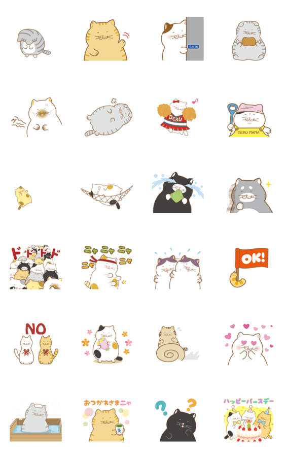 「でぶねこ」初のアニメーションスタンプが登場ニャ。ぽっちゃり体形のでぶねこたちが、みなさんのトークを癒してくれますニャ♪