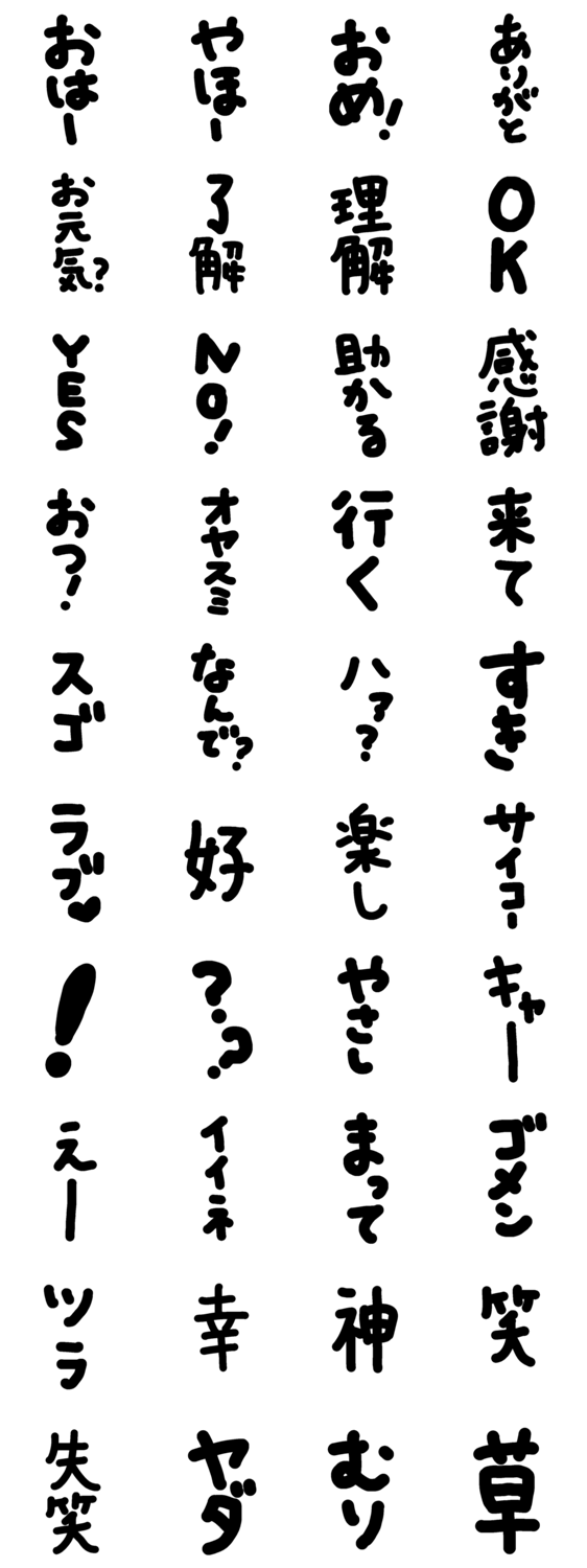 とにかく伝えたい言葉をどでかい手書き文字で表します。 デカ文字/でか文字/シンプル/日常/ヘタ文字/へた文字/ヘタ字/へた字 ※このスタンプはトークルームで大きく表示されるBIGスタンプです。