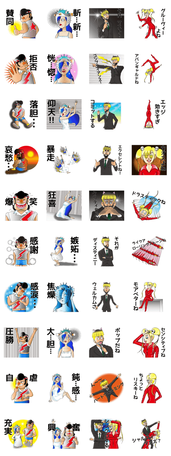 必要以上に横文字を使いたがる男女と、感情を漢字2文字で表現しがちな男女の面白おかしいスタンプです。