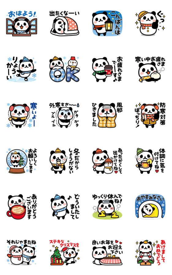 無難なパンダの無難に使えるアニメーションスタンプ。冬に便利なスタンプです。クリスマス&お正月入り♪