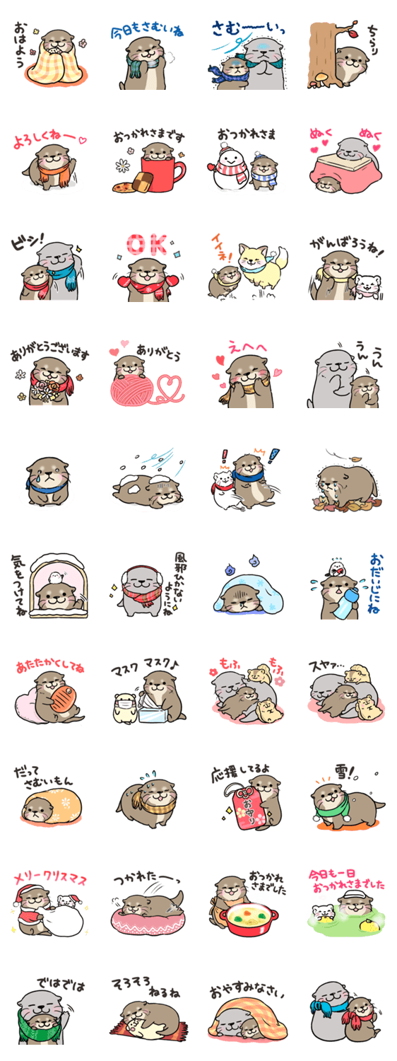 寒い冬はみんなで集まってぬくぬく♪カワウソさんたちのスタンプです。