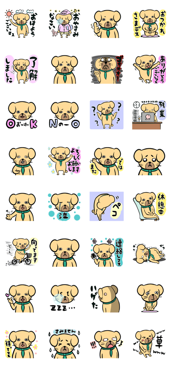 日々、社会のストレスの中で必死に生き抜く犬のスタンプです★次の日が休みだとテンション高めで仕事も頑張ります★ストレス社会で生きる皆様へ、使いこなして下さい★