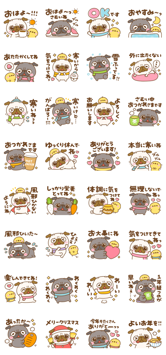 冬に可愛い♪フォーンパグちゃん、黒パグちゃんのスタンプです。クリスマスや年末にも♡