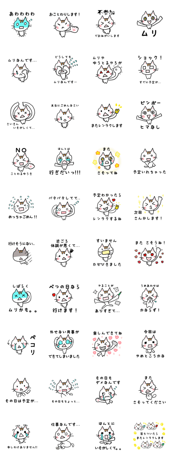 せっかくのお誘いをお断りする時の申し訳ない気持ちをスタンプにしました。ねここスタンプシリーズです。