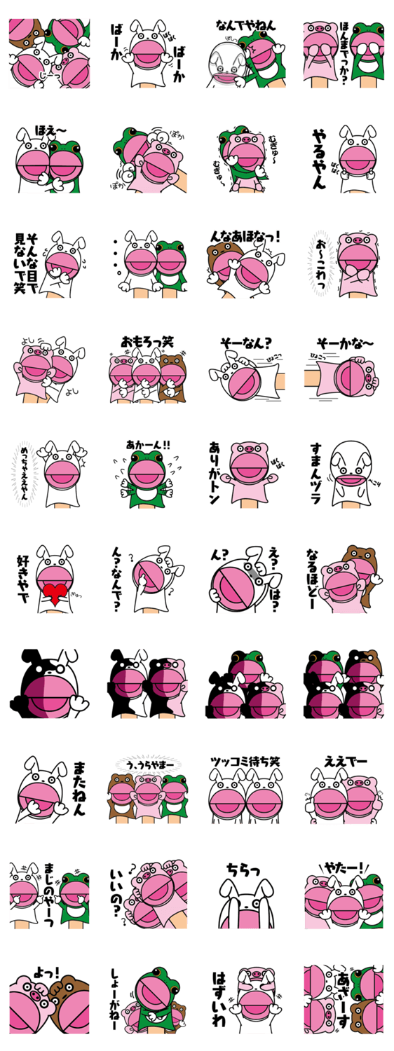 うさっぴー、ぶーたん、けろきち、くまぷーのぬいぐるみで気持ちを伝えるスタンプ。