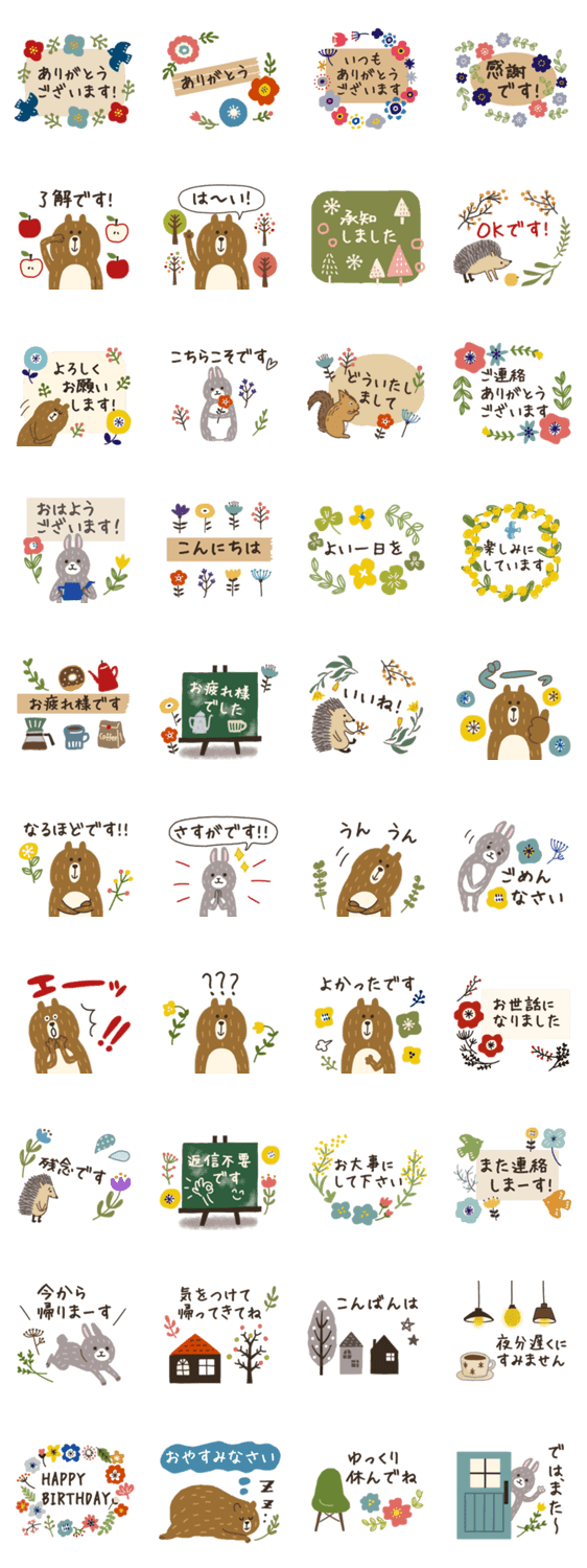 日常で使いやすい敬語のスタンプです。北欧風の動物と植物のイラストです。くま、うさぎ、ハリネズミ、リス