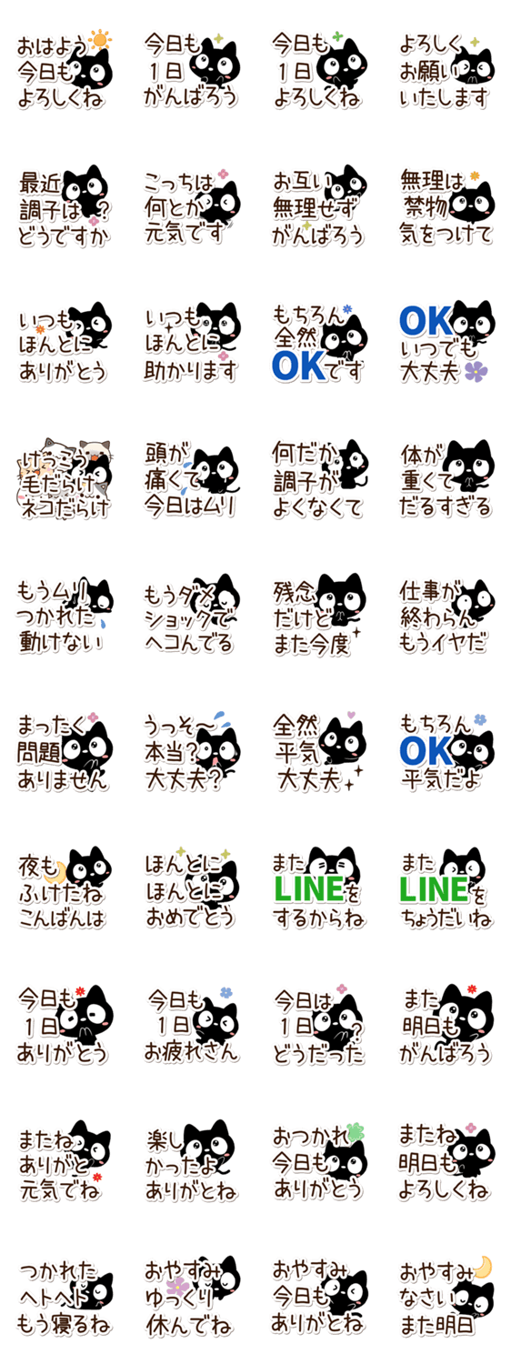 『クロネコすたんぷ』の読みやすい語呂合わせのようなスタンプです。標語のようなテンポのよい言葉の、文字の多いスタンプです。一度に気持ち等を伝えることができます。