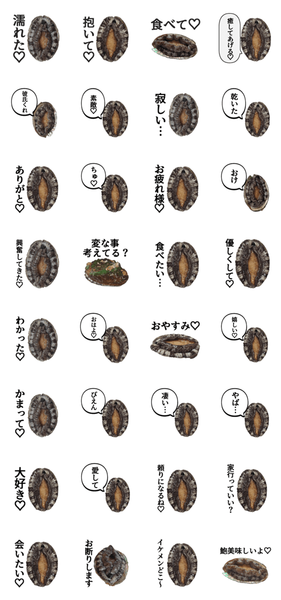 使いやすい鮑のスタンプです。愛情表現や構って欲しい時にぴったりです。カップルや彼氏彼女で使うのもおすすめします。貝/食べ物/あさり/ハマグリ/シュール/しじみ/サザエ