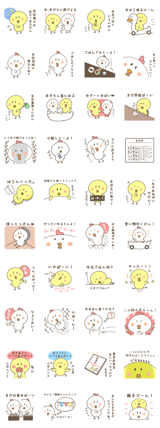 ニワトリとヒヨコが喋る親子専用スタンプです。にわとり(親御さん)、ひよこ(お子さん)で使ってね!熊本弁、佐賀弁、長崎弁の方も使えると思います。夫婦でも使えます!