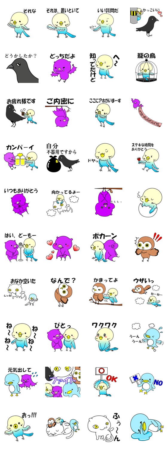 翼のある仲間たちのスタンプです。インコ、コウモリ、翼ねこ、カラス、フクロウ、ペンギンがメンバーで、随時メンバー募集中です。