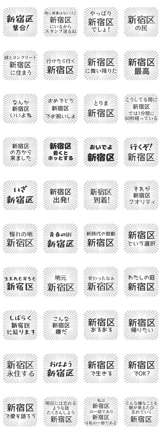 東京23区を舞台にした漫画風セリフスタンプ。集中線で叫べ。地元の人にも憧れてる人にも。面白いのが見つかると嬉しい。集中線。地元愛。