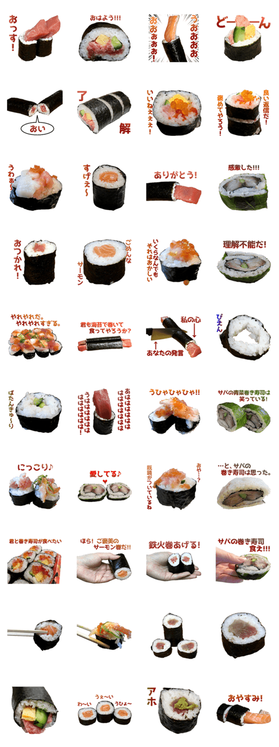 巻き寿司のスタンプです。シャリと具材と幸せが巻かれた巻き寿司をどうぞ。鉄火巻、サーモン巻、サバ青菜巻き、SUSHI、飯テロ、お寿司、写真。実写食べ物スタンプシリーズ