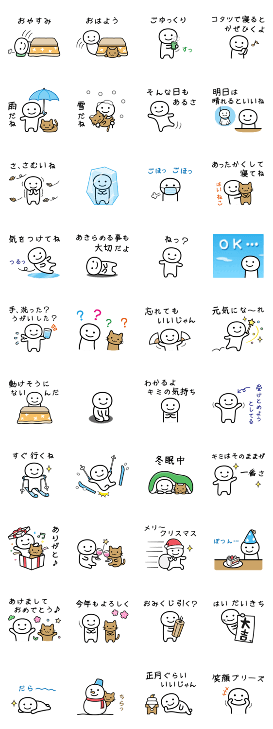 自分にも相手にも、ちょっと甘い所があるスタンプの第5弾です。今回は仲良しのねこと一緒に、クリスマス、お正月など…のんびり冬を過ごします。