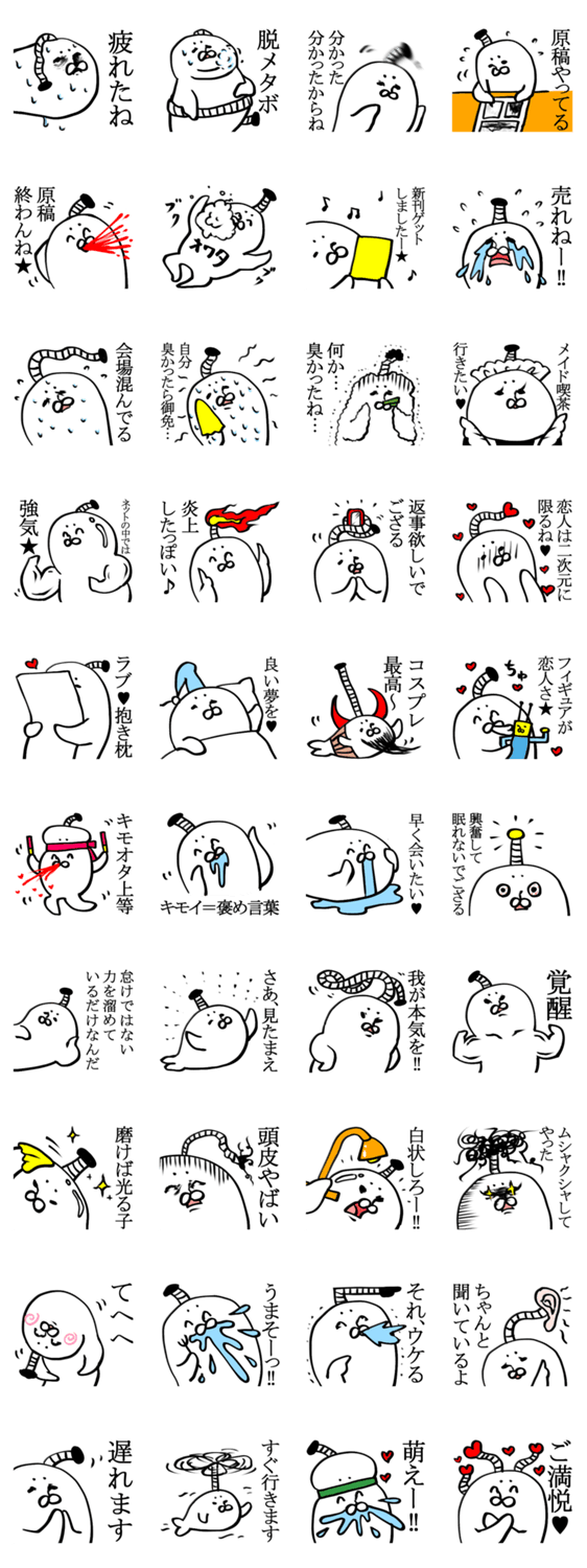 感情によってちょんまげが変化するアザラシのスタンプです。ヲタク仕様となっています