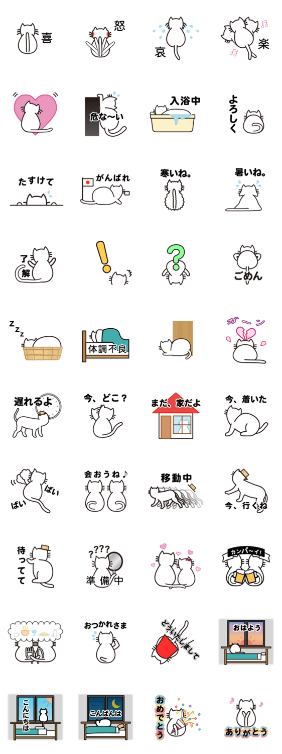 このスタンプは、後ろを向いた白猫が、日常会話やお出掛けする時に使えそうな会話を表現しました。ぜひ、身近な出来事などに使って欲しいスタンプです。