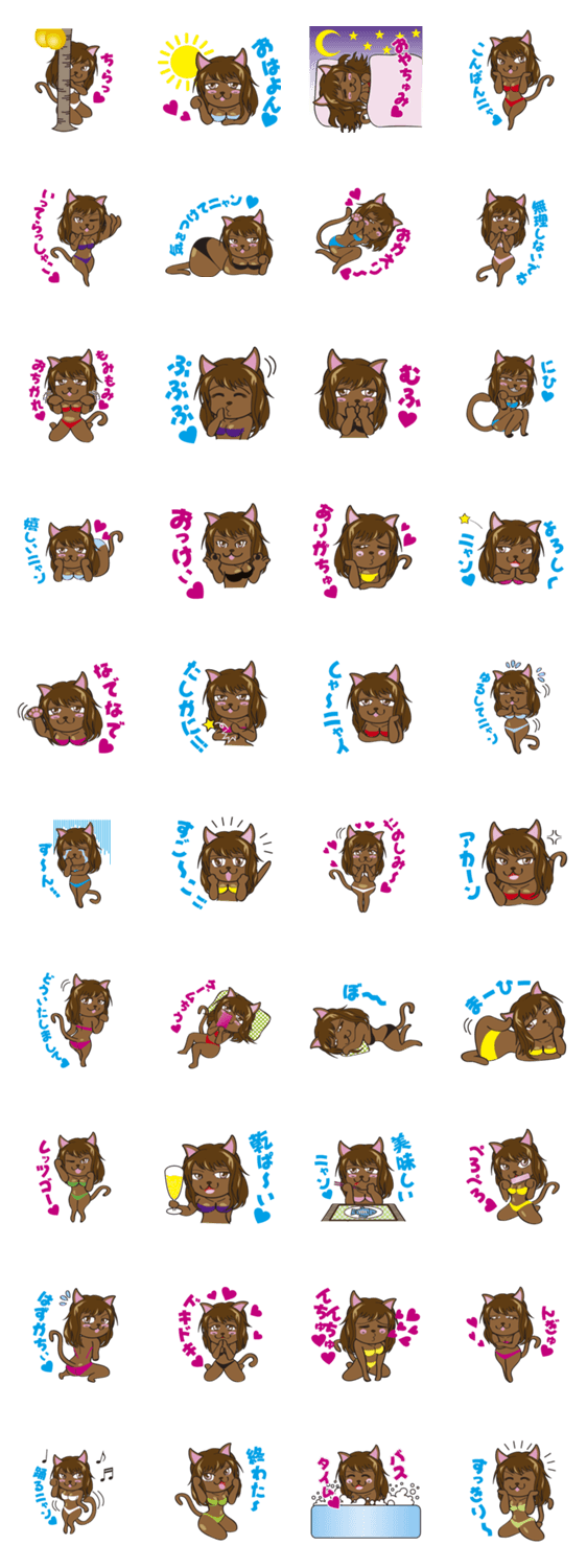 こんがりセクシーなかわいい水着ネコちゃんです。姉妹スタンプの白ネコと一緒にカップルで使ってください。