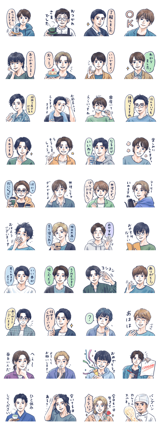 全て違う色々なイケメン男子からの労いの言葉スタンプです。お疲れのお友達、家族へ是非送って癒やしてあげましょう! 敬語多めなので先輩方への労いにもおすすめ!
