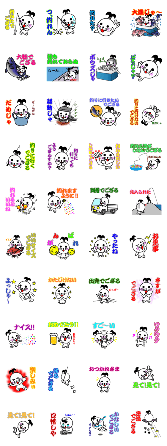 ルアーフィッシング、投げ釣り、サビキ釣りが大好きなあざらしのスタンプ「釣りざむらい」です。釣り全般、釣り以外の一般会話でも使いやすいものを集めました。