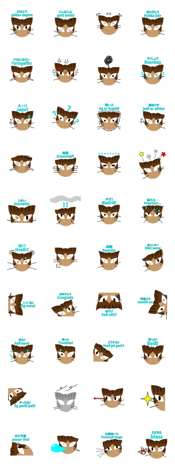 シンプルな猫キャラで、海外でも使えるスタンプをコンセプトにアイスランド語を付け加えました