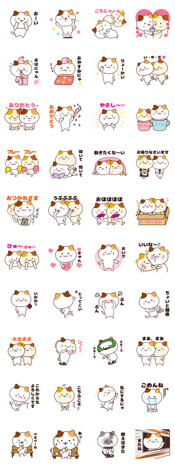 友達や家族との日常会話に適したかわいい三毛猫のやりとりです。寄り添ったかわいいねこちゃんが恋人や夫婦のカップルにもおすすめです。