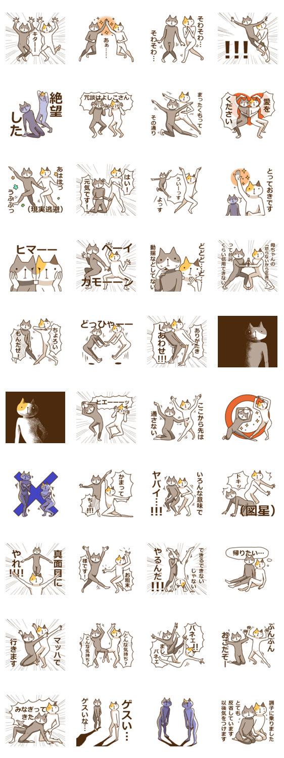 二匹の猫が繰り広げるシュールなスタンプ第三弾!キモくてうざい、でもクセになっちゃう!?どんなときもテンションだけで乗り切れるスタンプに仕上がりました。