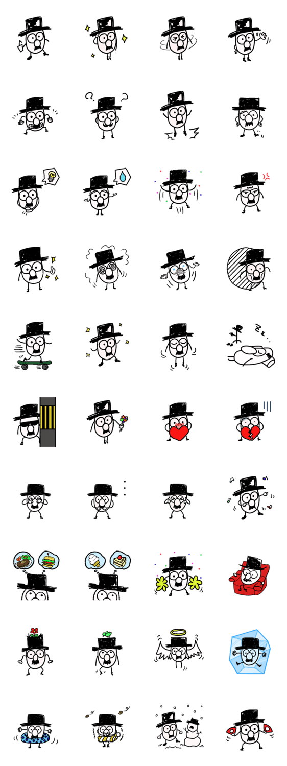 シルクハットとちょび髭がトレードマークの「トップハットマン」のモノクロスタンプです。あなたに代わって、心情を表現してくれるので、いろいろと使いやすいです。