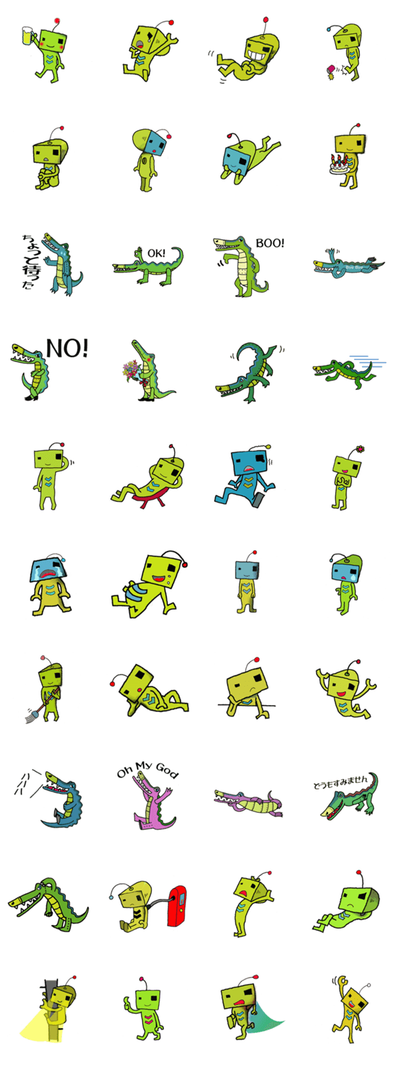 気の弱いロボットとやんちゃなワニロボットのスタンプです。