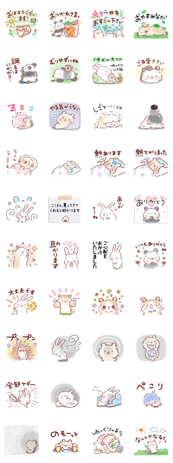 ちょっと元気・やる気が出ない・疲れて体調がいまいちな時などに使えるスタンプです。頑張りすぎず、休む時間も大切に♪ 相手への労い・日常のトークに添えて。