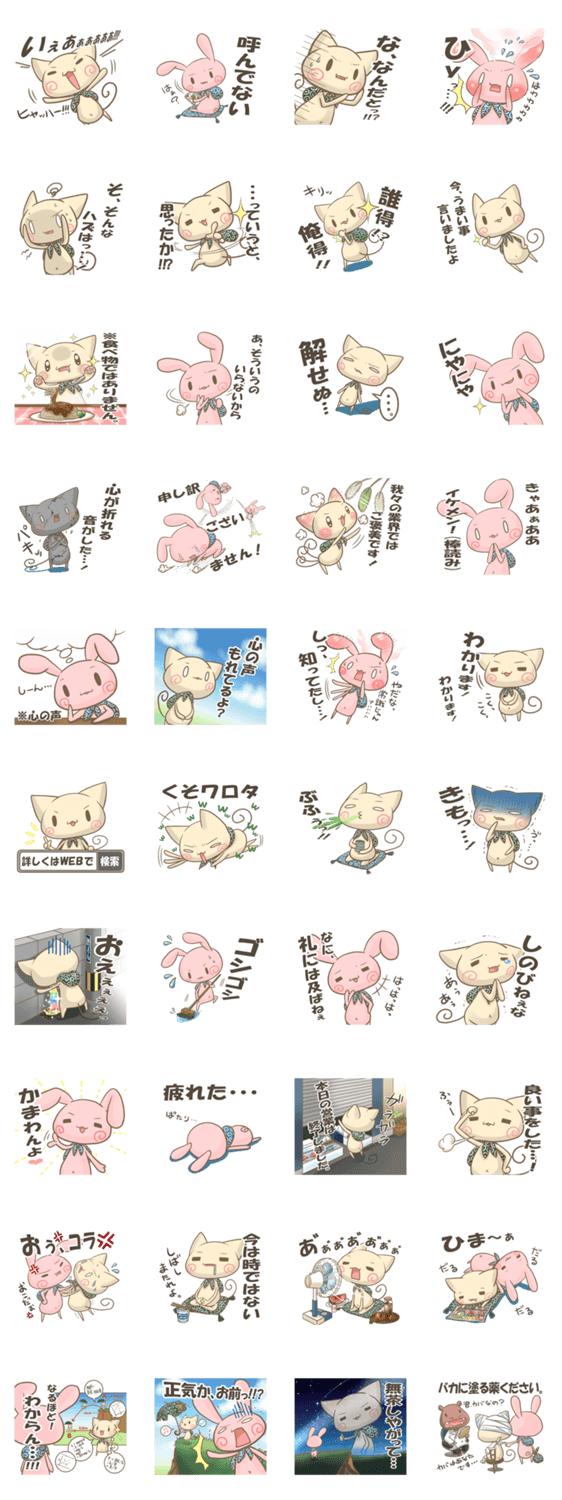 グループトークで使いやすい!ぐるぐるほっぺが可愛い、猫と兎のスタンプ第五弾です。