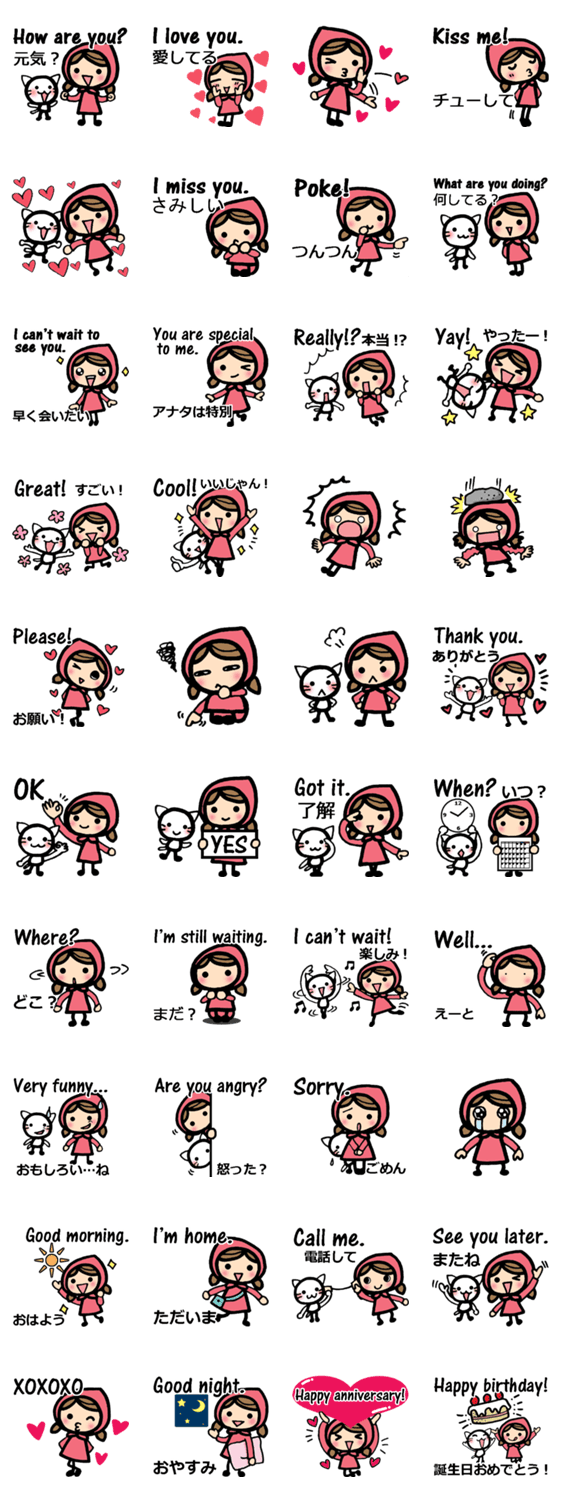 彼氏彼女が外国人のためのスタンプ。日本語と英語のバイリンガル。略語はあまり無いので母国語が英語でないカップルでも分かりやすい。英語や日本語を勉強している人にも。