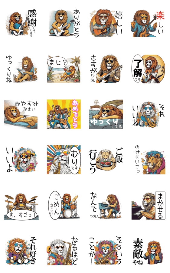 ロックな雰囲気のライオン達が楽器を演奏しながら会話するスタンプです。カッコ・可愛いスタンプでどなたでも利用しやすくなっています