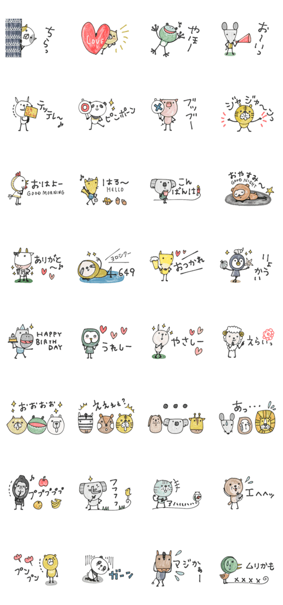 優しいタッチのゆるかわアニマルズ。小さめスタンプで使いやす♪