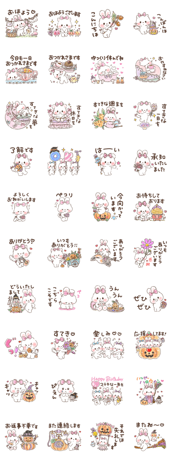 リボンギャルズ(うさぎりぼん、ねこりぼん、くまりぼん)秋の日常スタンプです。挨拶/敬語/ハロウィン/かぼちゃ/コスモス/黒猫/モズ/メルヘン/ファンシー/兎/猫/熊/水彩