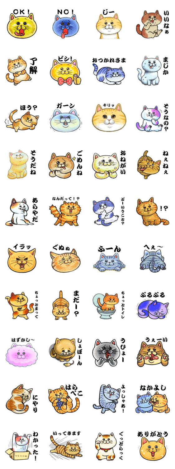つぶらな瞳の猫たちの日常的に使えるスタンプです。