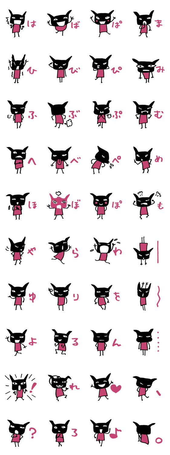 わるものとひらがな一文字のスタンプ。ひらがな50音の後半「は」行から「ん」までとその濁音、半濁点、記号、句読点のセットです。