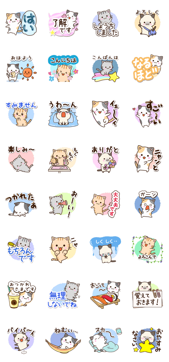 『おちゃめなネコたち』の便利スタンプ。三毛猫、トラねこ、ぶち猫、シャムネコ等が登場。サバトラやアメショ、ラグドール、サイベリアン等の猫好きの方にもぜひ【かたこ】