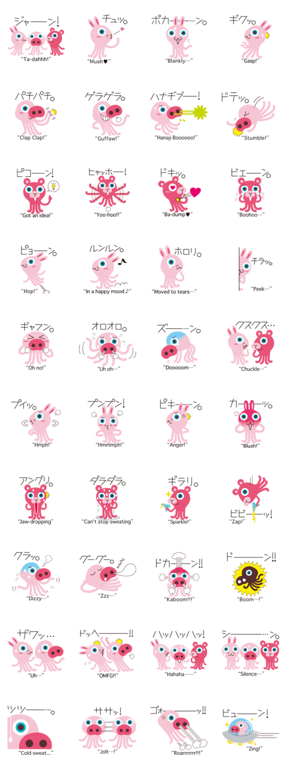 ぶたや、うさぎや、くまに似た火星人が、地球に来てスタンプになりました。第二弾オノマトペ編です。