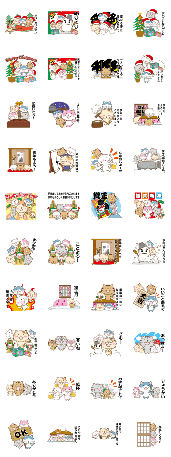 クリスマスと大晦日と正月に使えるスタンプです。猫たちのメッセージ!