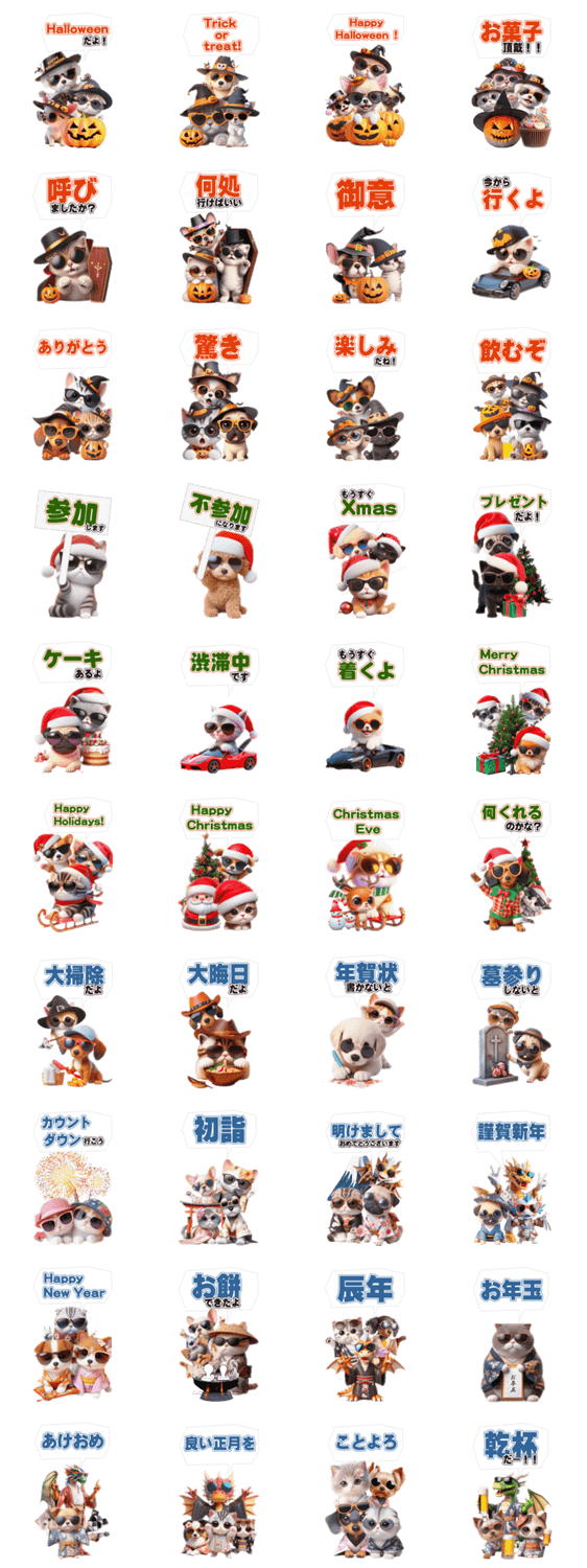 クールな猫と犬の夢のコラボ!LINE大スタンプ! 年末セット2。 HalloweenからXmas、年末年始のお得な3点セットです。かわいらしいキャラクターと心温まるメッセージ! ※このスタンプはトークルームで大きく表示されるBIGスタンプです。