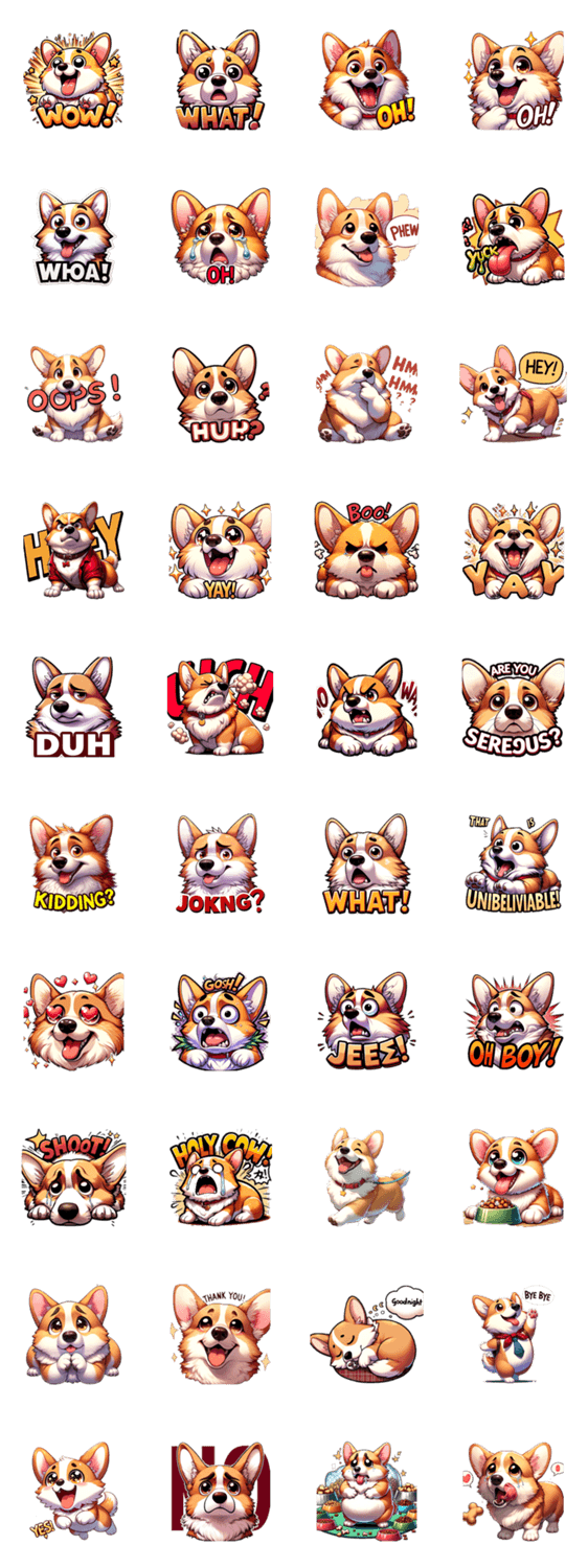 愉快なコーギー犬ジャムが喜怒哀楽するスタンプです。A stamp showing the joys and sorrows of the funny Corgi dog Jam.